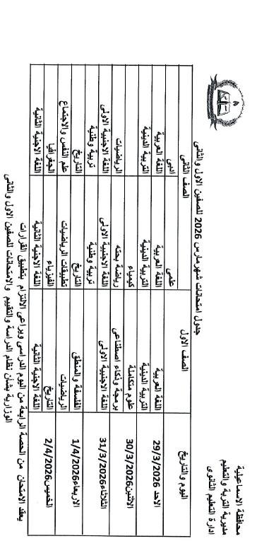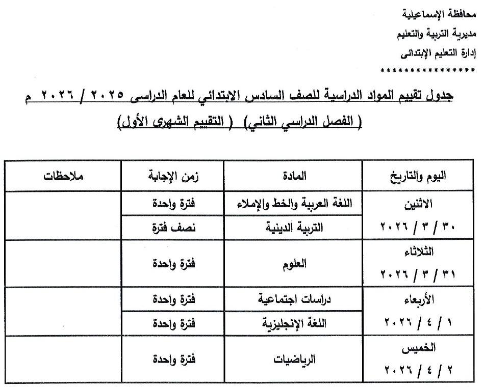 جدول امتحانات شهر مارس 2026 لصفوف النقل بالإسماعيلية