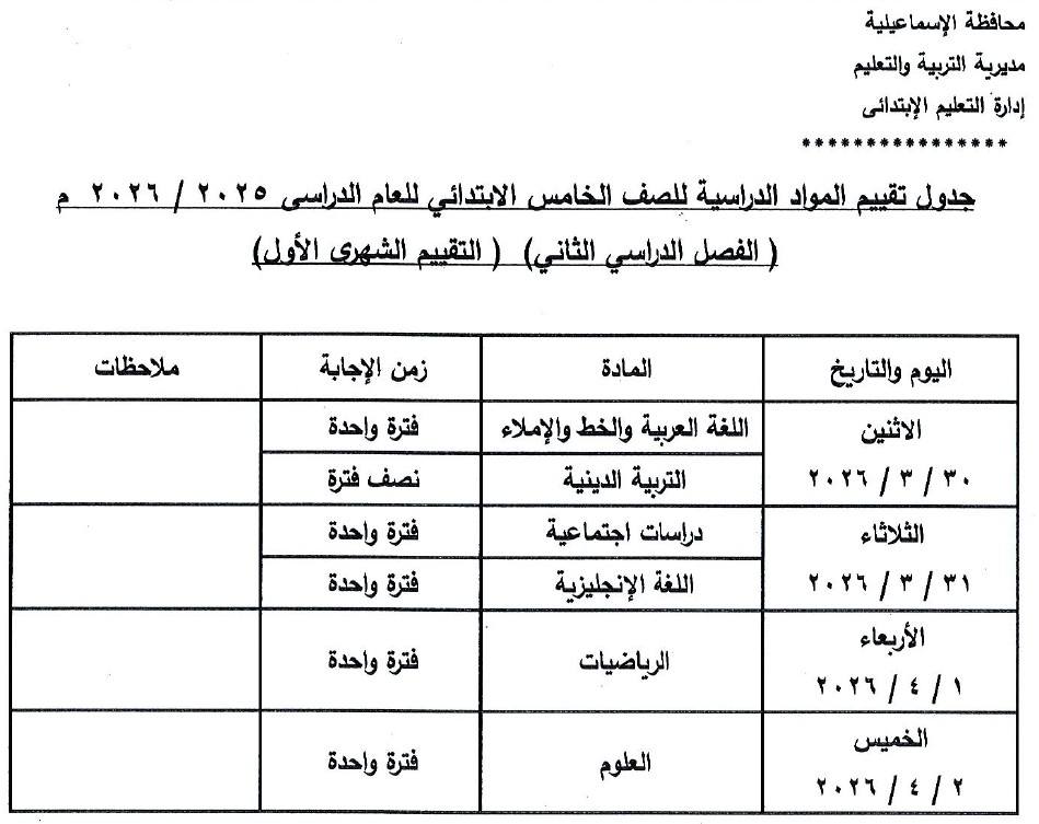عاجل| جدول امتحانات شهر مارس 2026 لصفوف النقل بالإسماعيلية