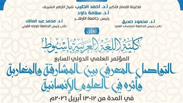 تعقد كلية اللغة العربية بجامعة الأزهر بأسيوط مؤتمرها الدولي السابع بعنوان: "التواصل المعرفي بين المشارقة والمغاربة وأثره في العلوم الإنسانية" يومي 12 و13 من شهر إبريل المقبل، برئاسة الدكتور صابر السيد، عميد الكلية رئيس المؤتمر، وبرعاية الإمام الأكبر الأستاذ الدكتور أحمد الطيب، شيخ الأزهر الشريف، والدكتور سلامة جمعة داود، رئيس الجامعة، والدكتور محمد عبد المالك، نائب رئيس الجامعة للوجه القبلي، والدكتور محمود صديق، نائب رئيس الجامعة للدراسات العليا والبحوث.