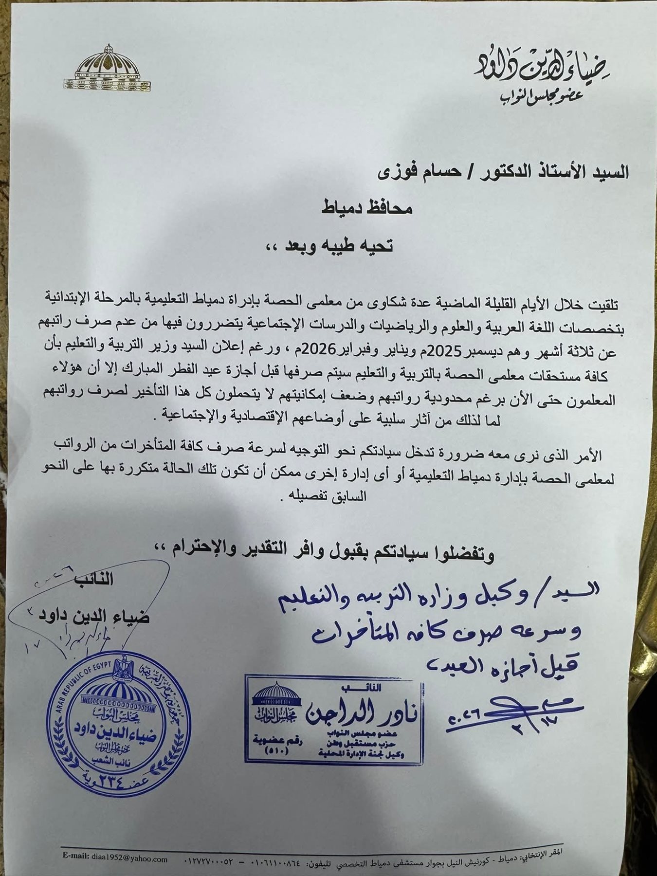 وأشار إلى أنه تلقى خلال الأيام القليلة الماضية عدة شكاوى من معلمى الحصة بإدارة دمياط التعليمية بالمرحلة الإبتدائية بتخصصات اللغة العربية والعلوم والرياضيات والدراسات الإجتماعية يتضررون فيها من عدم صرف راتبهم عن ثلاثة أشهر وهم ديسمبر 2025م ويناير وفبراير 2026م.