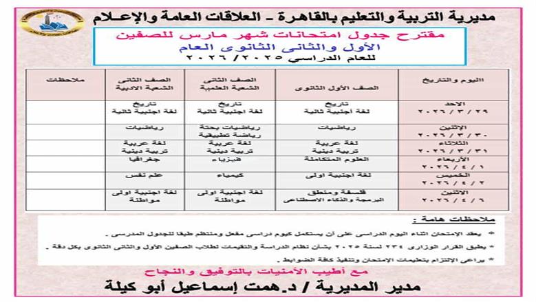 - جداول امتحانات مارس 2026 محافظة القاهرة
