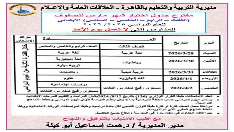 كشفت مديرية التربية والتعليم بالقاهرة، تحت إشراف همت إسماعيل أبو كيلة، عن مقترح جداول امتحانات شهر مارس 2026 لصفوف النقل بمراحلها الثلاث (الابتدائي – الإعدادي – الثانوي)، للعام الدراسي 2025 - 2026.