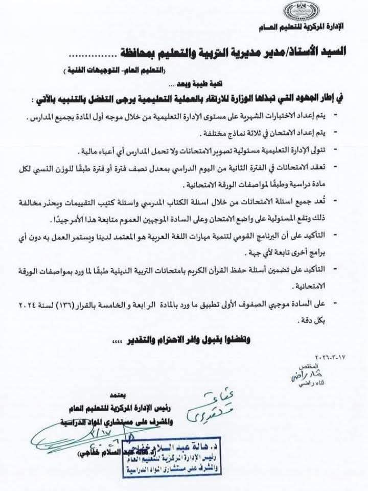 • تعد جميع أسئلة الامتحانات من خلال اسئلة الكتاب المدرسي وأسئلة كتيب التقييمات ويحذر مخالفة ذلك وتقع المسئولية على واضع الامتحان وعلى السادة الموجهين العموم متابعة هذا الأمر جيدا.