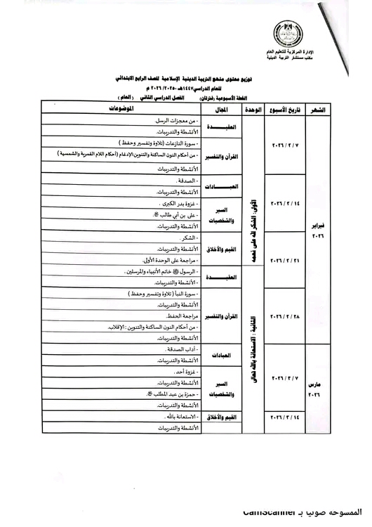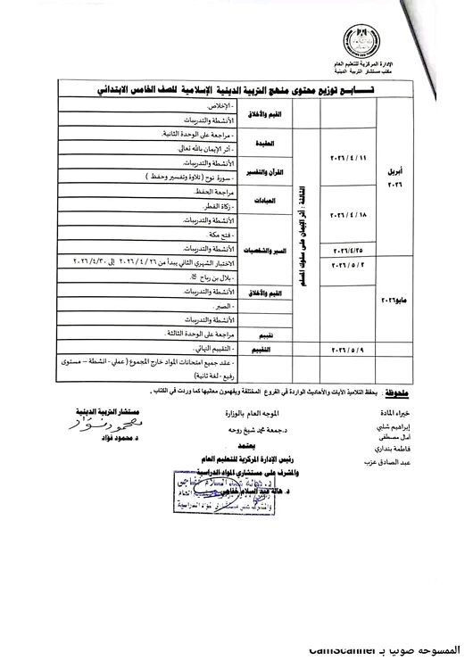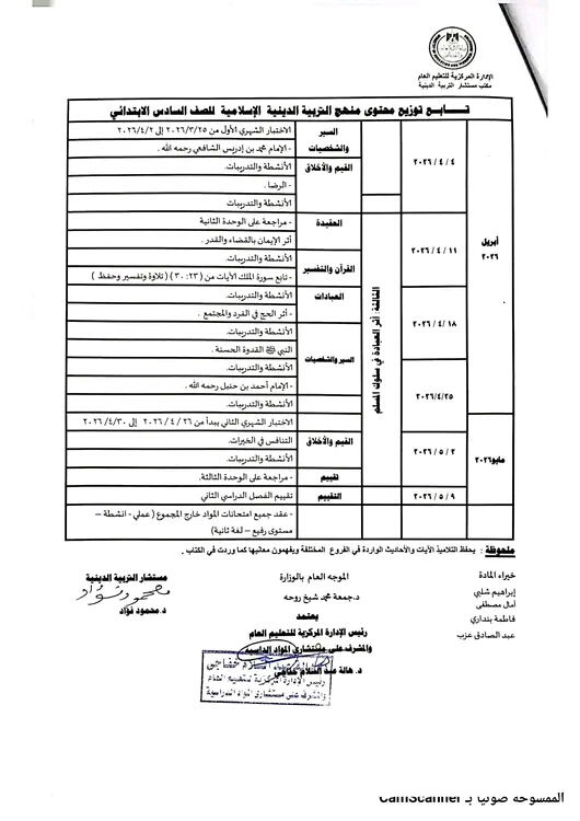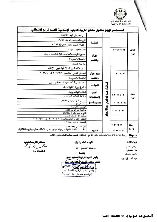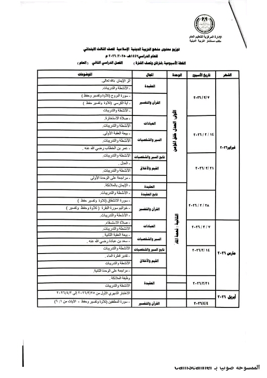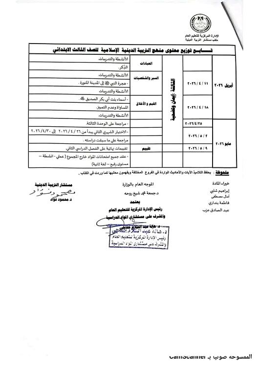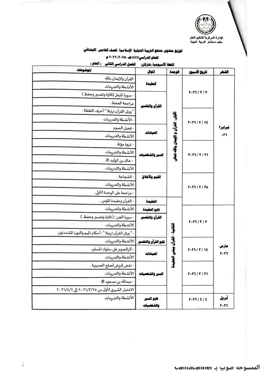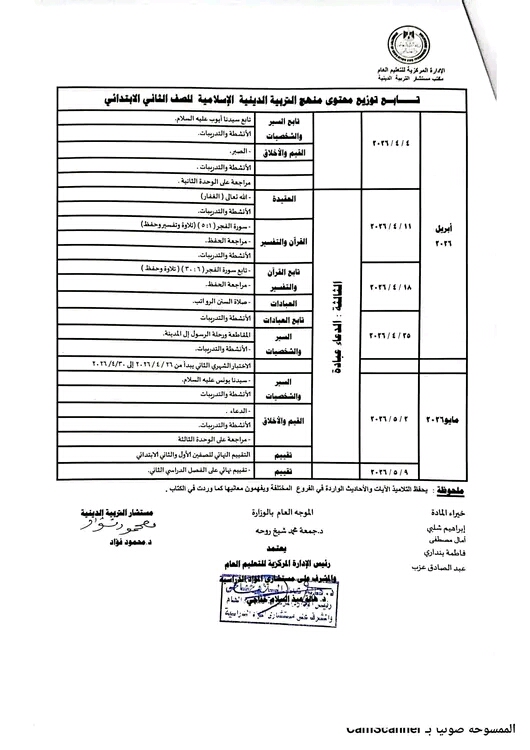 ويمكن للطلاب والمعلمين معرفة توزيع منهج التربية الدينية للمرحلة الابتدائية 2026 الترم الثاني من خلال الصور التالية:
