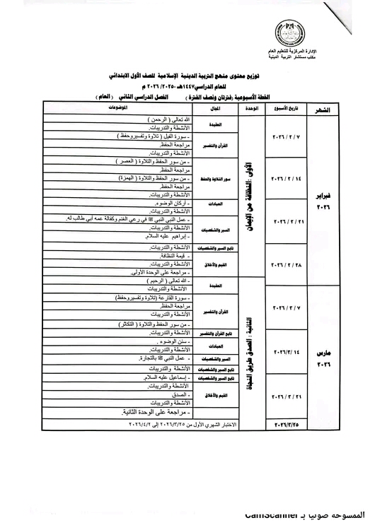 توزيع منهج التربية الدينية للمرحلة الابتدائية 2026 الفصل الدراسي الثاني