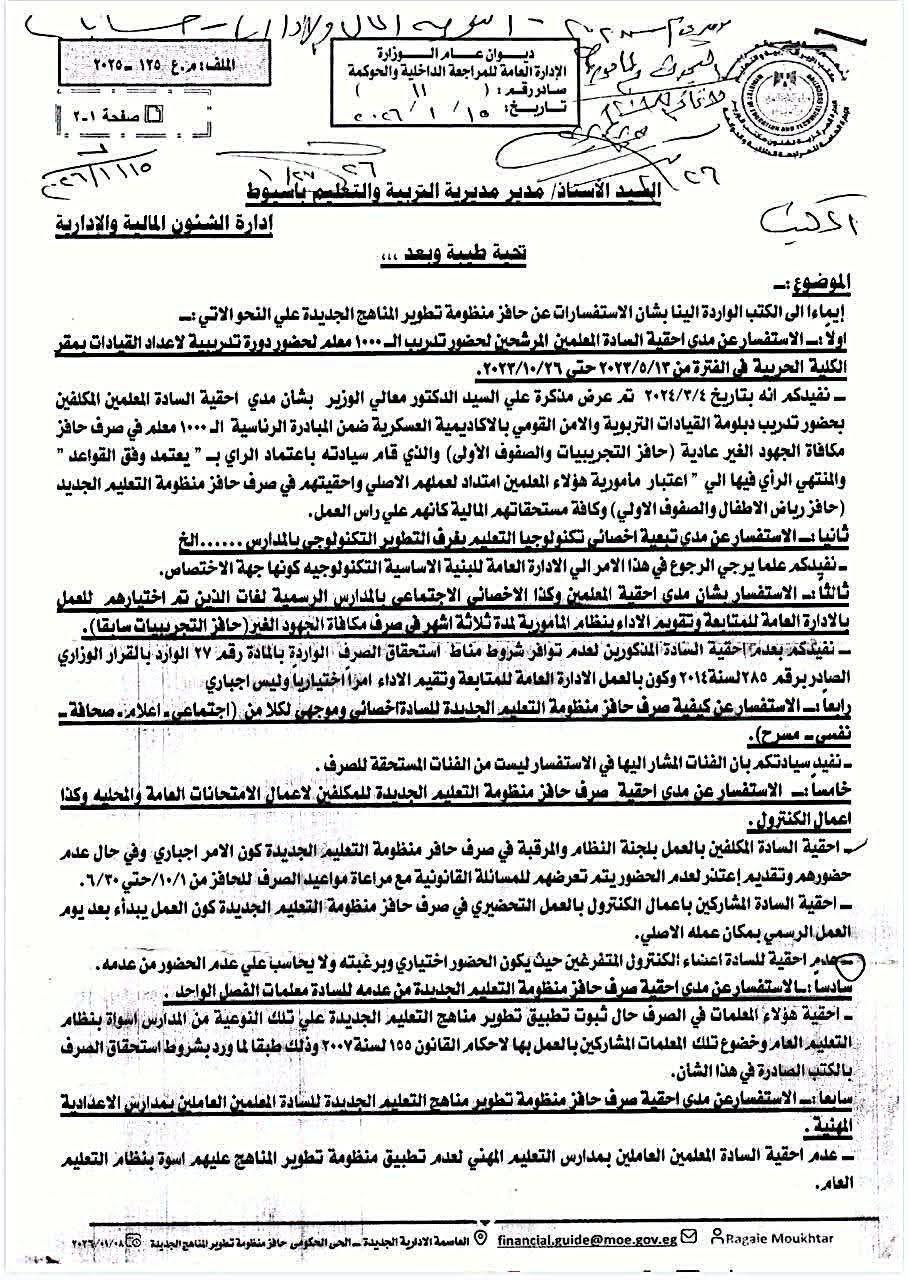 عممت وزارة التربية والتعليم والتعليم الفني، خطابا على المديريات التعليمية، بشأن الاستفسارات عن حافز منظومة تطوير المناهج الجديدة على النحو الآتي: