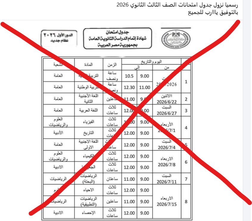 وفي هذا السياق، أكدت وزارة التربية والتعليم والتعليم الفني أن الجدول المتداول غير صحيح ولا يمت للحقيقة بصلة، مشددة على أنه لم يتم الإعلان رسميًا عن جدول الامتحانات حتى الآن.