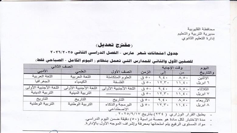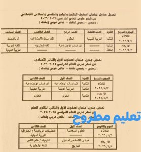 أوضحت مديرية التربية والتعليم بالقليوبية أنه تقرر تعديل جداول امتحانات شهر مارس في كافة مراحل التعليم الابتدائي والإعدادي والثانوي العام بسبب ترحيلها إثر تعطل الدراسة بسبب الأمطار والطقس السيئ كالتالي: