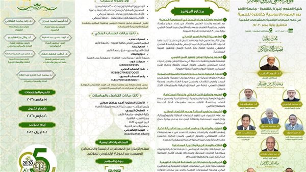 وأوضح عميد الكلية أنه من المتوقع أن يشهد المؤتمر مشاركة علمية واسعة من الباحثين والخبراء والمتخصصين في مختلف مجالات العلوم الأساسية، بما يعزز دور جامعة الأزهر كمؤسسة علمية رائدة تسهم في دعم مسيرة التنمية المستدامة وبناء مستقبل علمي واعد لمصر، لافتًا إلى أن أمانة المؤتمر تضم الدكتور أحمد رمضان صوفي، عميد الكلية رئيس المؤتمر، والدكتور كمال رسلان محمد، وكيل الكلية لشئون التعليم والطلاب نائب رئيس المؤتمر، بجانب ذلك تم اختيار الدكتور عبد الوهاب الشرقاوي عميد الكلية الأسبق وأحد أعلامها ليكون رئيسًا شرفيًّا للمؤتمر، وسوف يتم تكريمه علي هامش المؤتمر بحضور مشاركات واسعة من داخل مصر وخارجها.