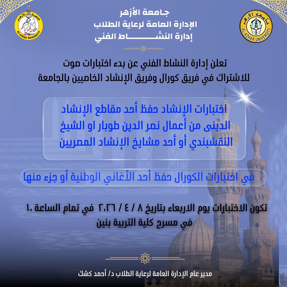 أعلنت جامعة الأزهر، من خلال الإدارة العامة لرعاية الطلاب (إدارة النشاط الفني)، عن بدء اختبارات الأصوات للطلاب والطالبات الراغبين في الانضمام إلى فريقي الكورال والإنشاد الديني.