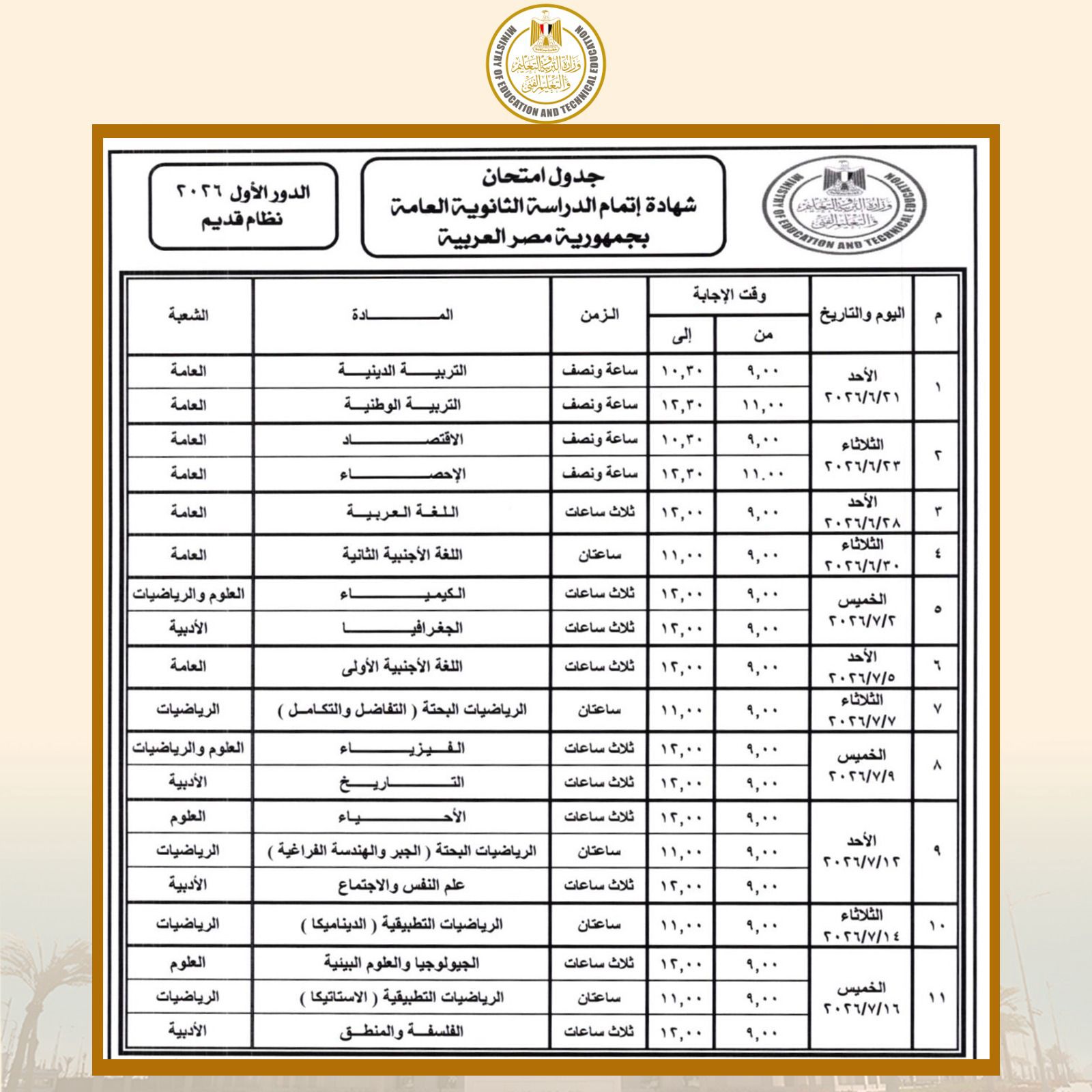 بعد اعتمادها.. ننشر جدول امتحانات الثانوية العامة للدور الأول 2026