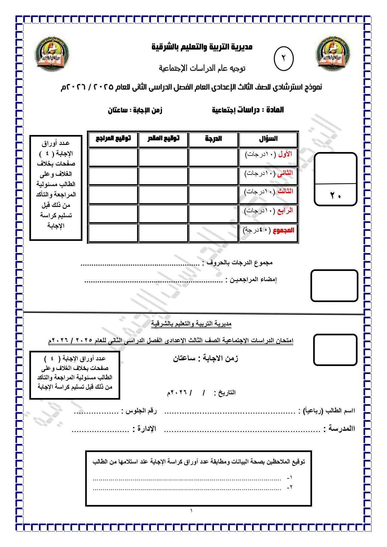 أتاحت مديرية التربية والتعليم والتعليم الفني بمحافظة الشرقية، نماذج امتحانات مادة الدراسات الاجتماعية للشهادة الإعدادية بنظام البوكليت الترم الثاني 2026.