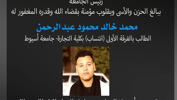 نعى  الدكتور أحمد المنشاوي، رئيس جامعة أسيوط، ببالغ الحزن والأسى، وبقلوبٍ مؤمنة بقضاء الله وقدره، الطالب/ محمد خالد محمود عبد الرحمن، الطالب بالفرقة الأولى (انتساب) بكلية التجارة – جامعة أسيوط.