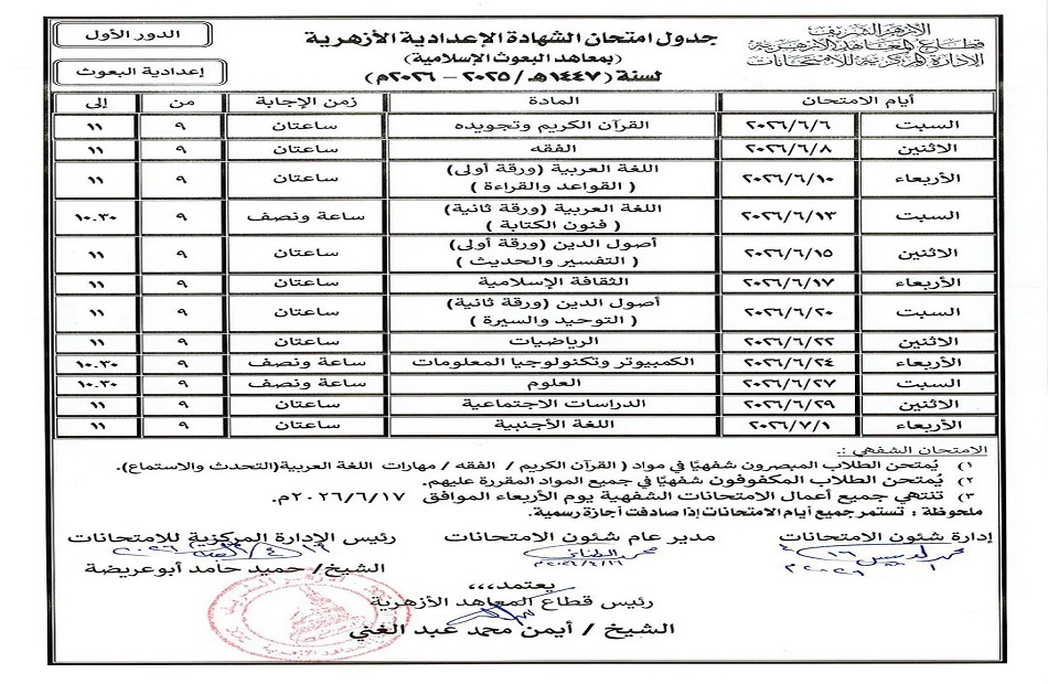 - جدول امتحانات الشهدة الاعدادية ازهر 2026