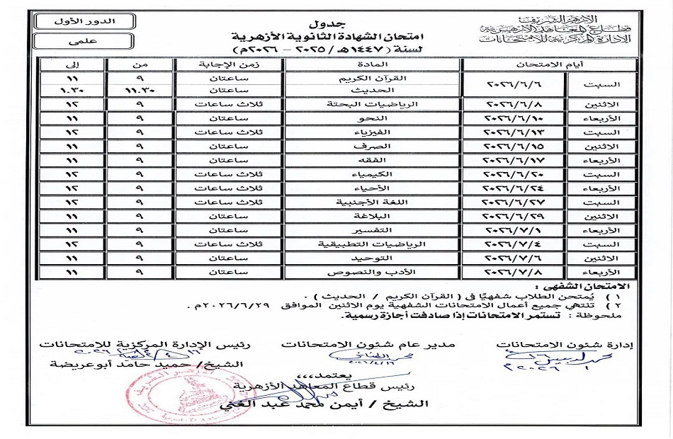 - جداول امتحانات الشهادة الثانوية الأزهرية