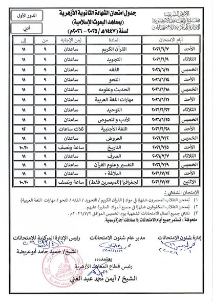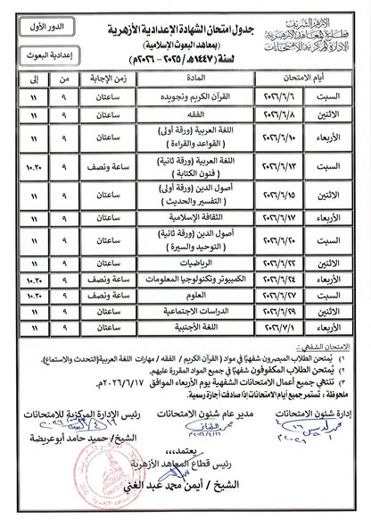 اعتمد اليوم السبت الشيخ أيمن عبد الغني، رئيس قطاع المعاهد الأزهرية، جداول امتحانات الشهادة الثانوية الأزهرية، والإعدادية (معاهد البعوث الإسلامية) للعام الدراسي ٢٠٢٦/٢٠٢٥م حيث قامت الإدارة المركزية للامتحانات برئاسة فضيلة الشيخ حميد حامد ابو عريضة، بإعداد جداول الشهادة الثانوية الأزهرية لهذا العام على النحو التالي: