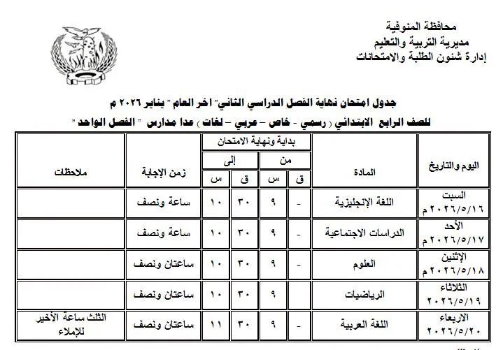 جداول امتحانات نهاية العام 2026 لصفوف النقل بالمنوفية