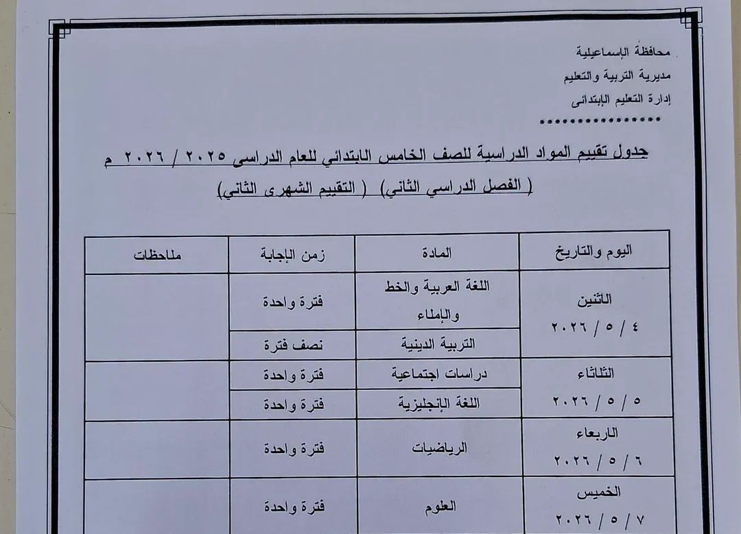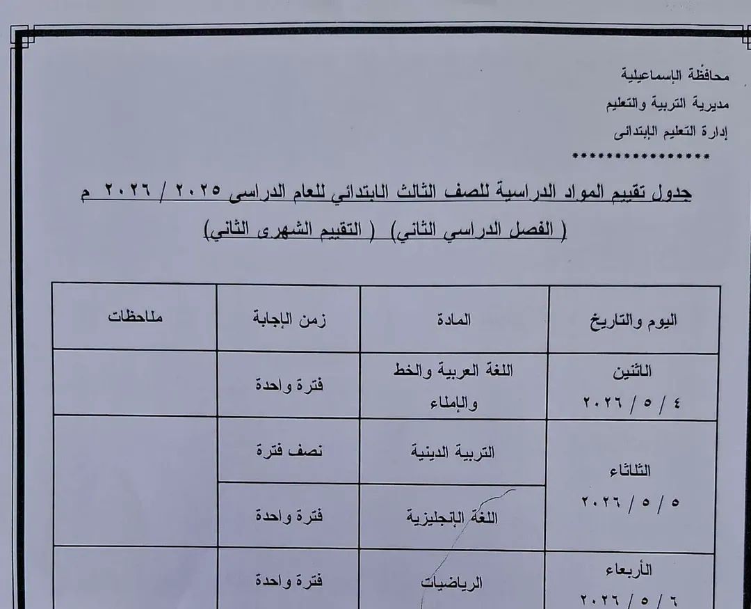 أعلنت مديرية التربية والتعليم بمحافظة الإسماعيلية، بقيادة الأستاذ أيمن موسى وكيل الوزارة، عن جداول التقييمات الخاصة بالفصل الدراسي الثاني، وذلك للتقييم الشهري الثانى لطلاب صفوف النقل بمختلف المراحل التعليمية (الابتدائية والإعدادية والثانوية).