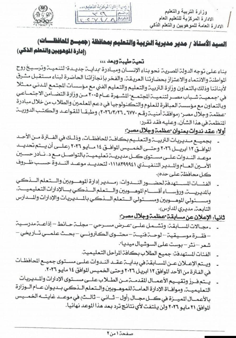 أعلنت الإدارة العامة للموهوبين والتعلم الذكي بديوان عام وزارة التربية والتعليم، بالتعاون مع جمعية شباب مصر لتنمية المجتمع ومؤسسة العباقرة للعلوم والتكنولوجيا، عن إطلاق مسابقة “عظمة وجلال مصر”، والتي تُقام خلال الفترة من 12 أبريل 2026 وحتى 14 مايو 2026، في إطار دعم وتنمية قدرات الطلاب الإبداعية بمختلف المراحل التعليمية.