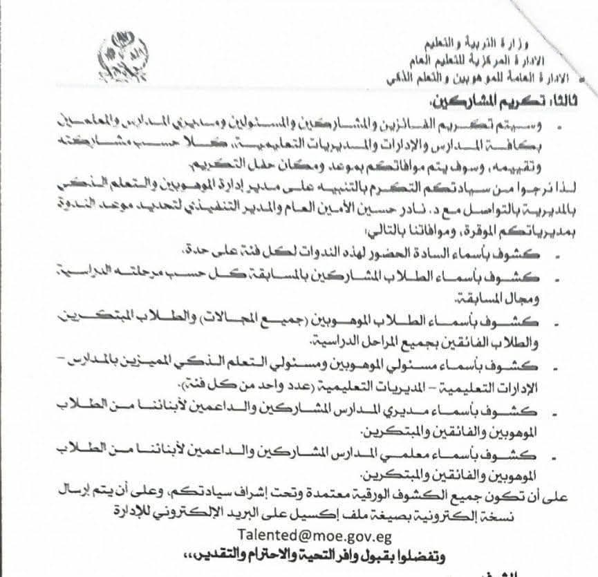 وأشارت إلى أن آخر موعد لتسليم الأعمال إلى أقسام الموهوبين بالإدارات التعليمية هو 14 مايو 2026، ولن يتم الالتفات إلى أي أعمال تُسلّم بعد هذا التاريخ.