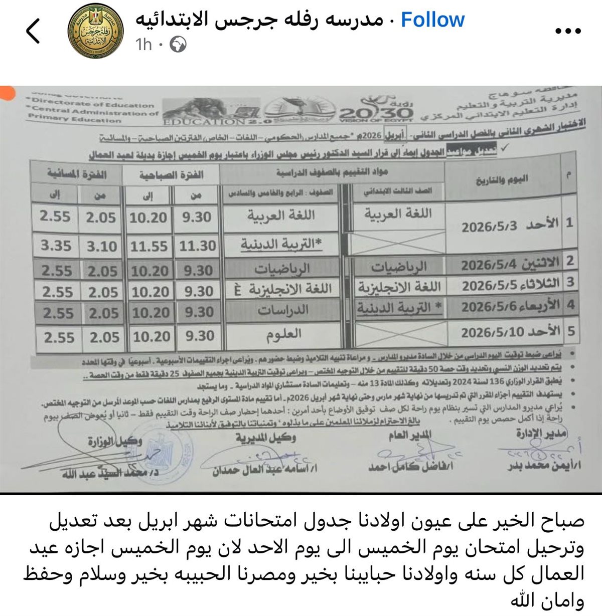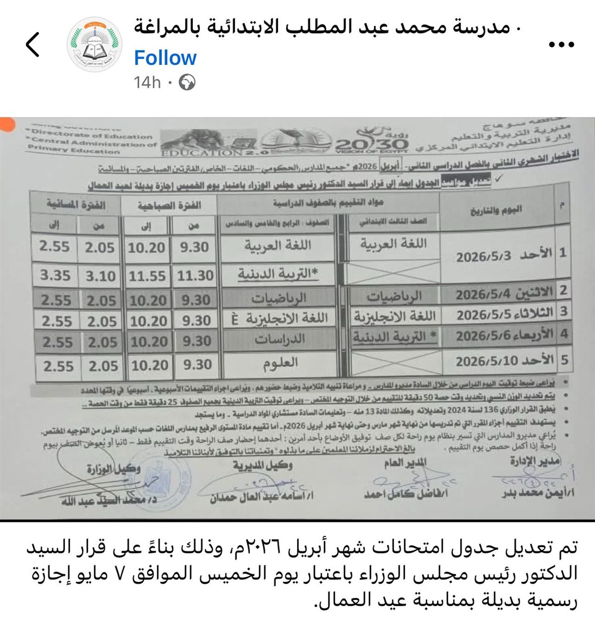 - جدول امتحانات شهر أبريل 2026 بعد تعديل بسبب إجازة عيد العمال