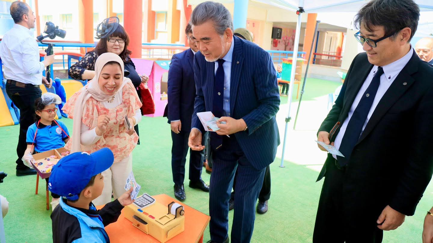 وكان في استقبال الوزير والمسئولين من الجانب الياباني طلاب المدرسة الذين رحبوا بالوفد من خلال أنشطة تفاعلية مميزة، تضمنت تنفيذ أنشطة التعلم باللعب باستخدام الصلصال، ومحاكاة مواقف شرائية في إطار تنمية مهاراتهم الحياتية.