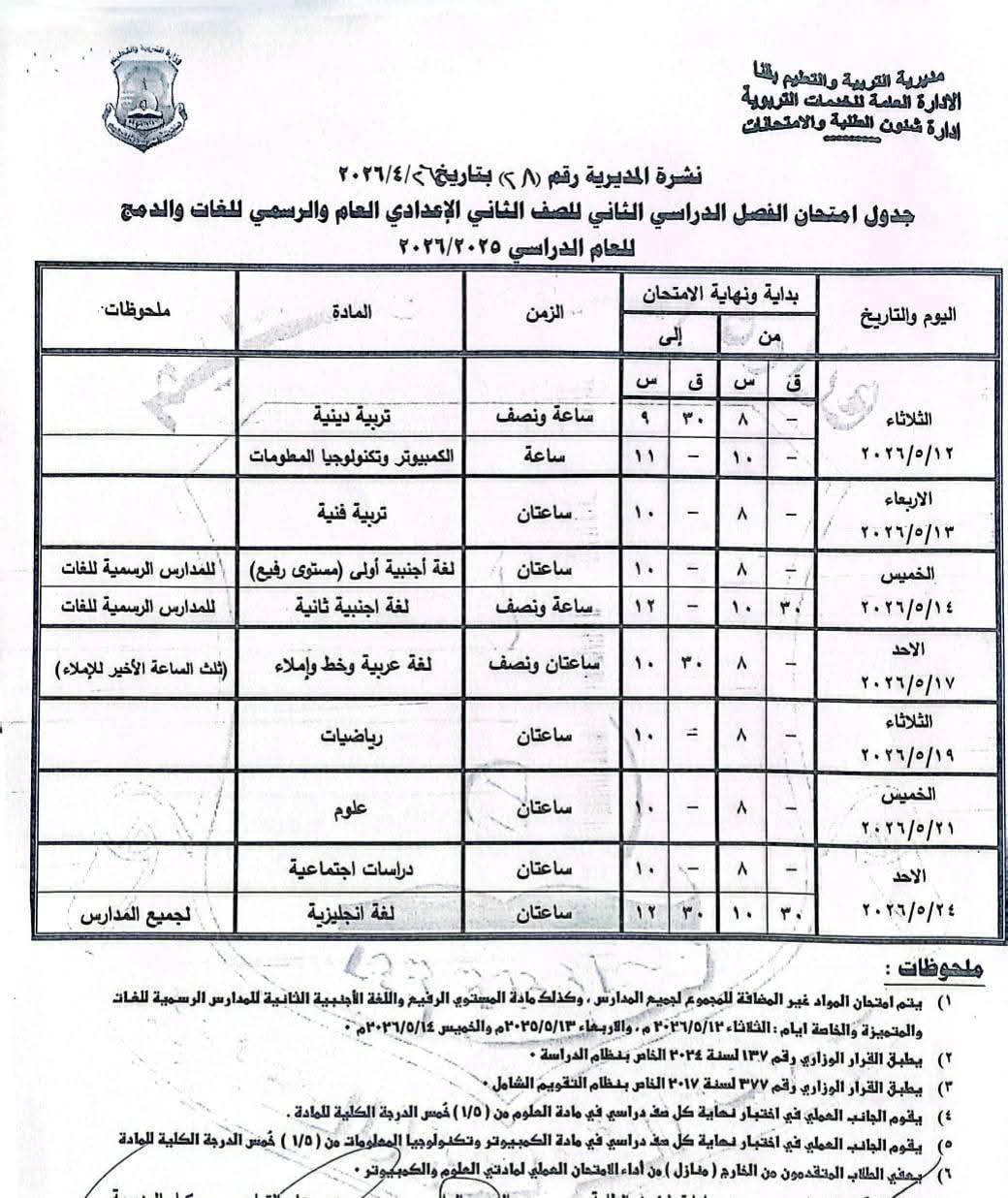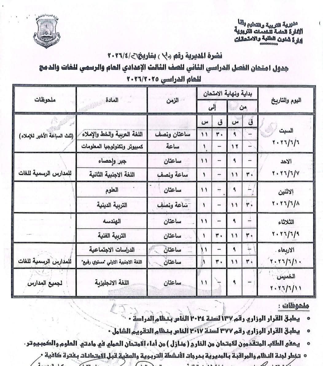 وتضمنت مواعيد امتحانات الترم الثاني 2026 لصفوف النقل والشهادة الإعدادية بمحافظة قنا الآتي:
