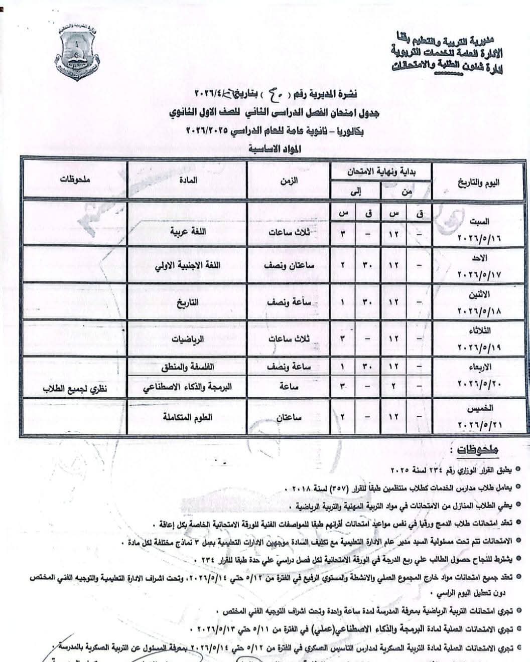 - جداول امتحانات الترم الثاني 2026 في محافظة قنا جميع الصفوف