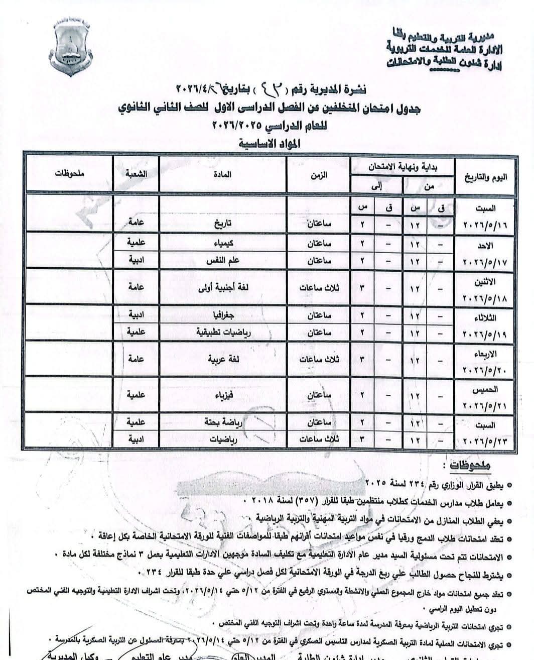 الصف الثاني الثانوي: من 16 مايو حتى 23 مايو 2026