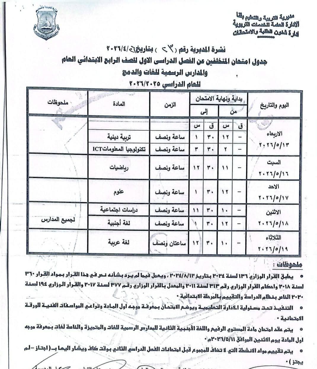 - جدول امتحانات صفوف النقل في محافظة قنا الترم الثاني 2026