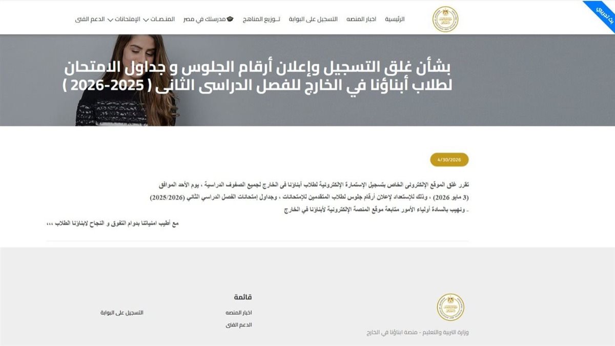 كشف وزارة التربية والتعليم والتعليم الفني تفاصيل جديدة بشأن غلق التسجيل الإلكتروني وإعلان أرقام الجلوس وجداول الامتحان لطلاب “أبناؤنا في الخارج” للفصل الدراسى الثانى 2025- 2026.
