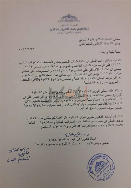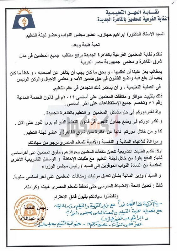 تقدم كرم عبداللاه، رئيس النقابة الفرعية للمعلمين بالقاهرة الجديد، بطلب للدكتور إبراهيم حجازي، عضو لجنة التعليم بمجلس النواب، لتقديم الطلبات التشريعية لتعديل مكافآت المعلمين وحوافزهم وحقوقهم على آخر أساسي.
