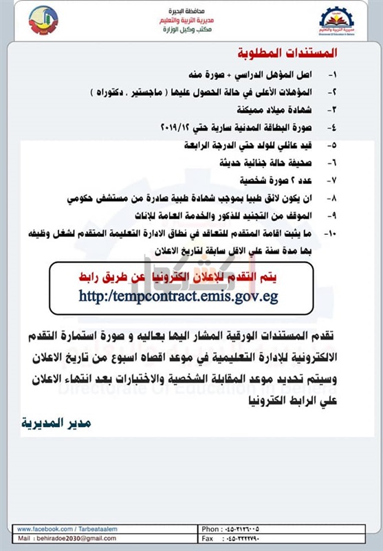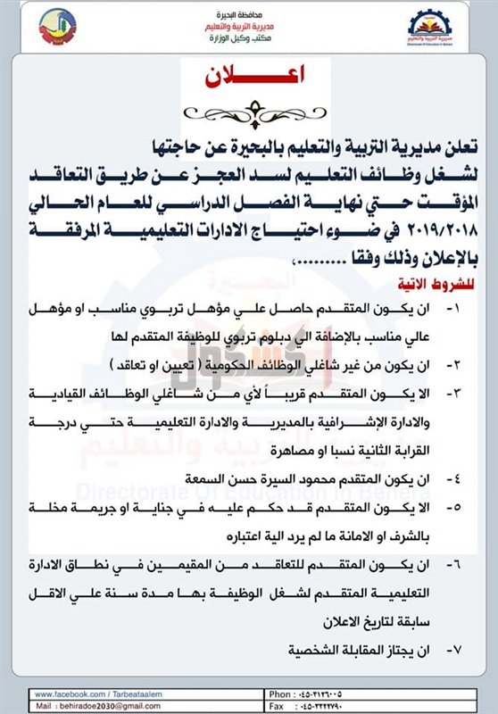 أعلنت مديرية التربية والتعليم بمحافظة البحيرة، اليوم الخميس، حاجتها لشغل وظائف التعليم لسد العجز عن طريق التعاقد المؤقت حتي نهاية الفصل الدراسي للعام الحالي، في ضوء احتياج الإدارات التعليمية وفق التخصصات المعلن عنها بكل إدارة تعليمية.
