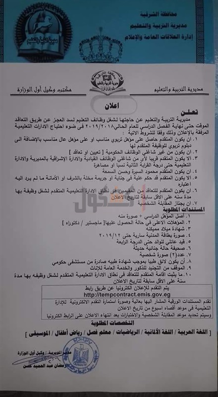 أعلنت مديرية التربية والتعليم بمحافظة الشرقية، اليوم الخميس، حاجتها لشغل وظائف التعليم لسد العجز عن طريق التعاقد المؤقت حتي نهاية الفصل الدراسي للعام الحالي، في ضوء احتياج الإدارات التعليمية وفق التخصصات المعلن عنها بكل إدارة تعليمية.