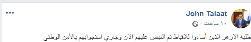طلاب من الأزهر، بعد الفيديو الذي تم نشره مسبقاً علي صفحتهم يسئ الي صلوات الأقباط،