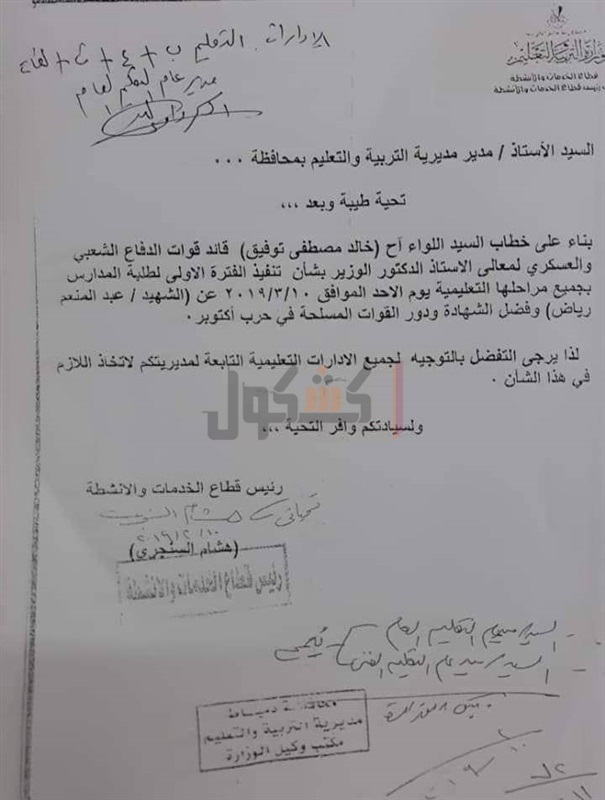 وجهت وزارة التربية والتعليم والتعليم الفنى، فاكساً للمديريات، أكدت خلاله أنه وفقاً لخطاب اللواء أركان حرب خالد مصطفي قائد الدفاع الشعبي والعسكري، إلي الوزير الدكتور طارق شوقي، حول تنفيذ الفترة الأولي لطلبة المدارس بجميع المراحل يوم ١٠ مارس المقبل، عن الشهيد عبدالمنعم رياض ودور القوات المسلحة في حرب أكتوبر.