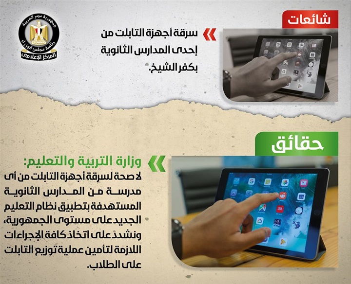 كشف المركز الإعلامي بمجلس الوزراء حقيقة ما تداولته بعض وسائل الإعلام وصفحات التواصل الاجتماعي من أنباء بشأن سرقة أجهزة التابلت من إحدى المدارس الثانوية.