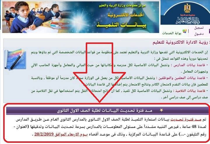 ووجهت الوزارة، مسئولى المعلومات بالمدارس بالتنبيه علي الطلاب بسرعة تحديث البيـانات وتدقيقها (العنوان - رقم التليفون -..وجميع البيانات.) على قــاعدة البيانات المركزية، وذلك فى موعد أقصاه يوم الاربعاء الموافق 20/2/2019 .