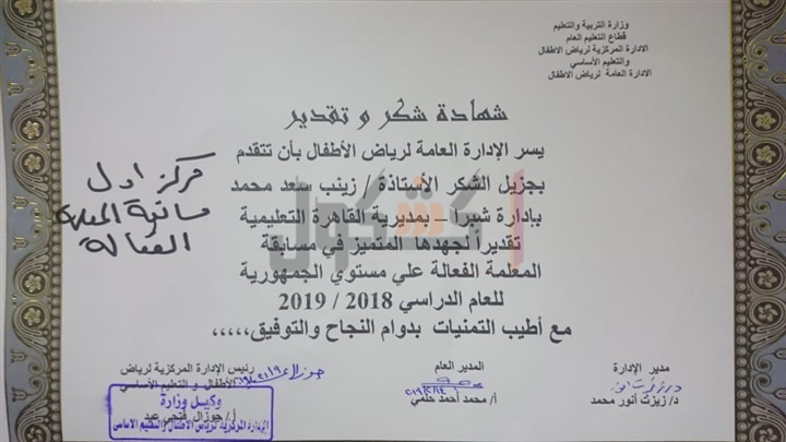 مدير عام إدارة شبرا التعليمية، معلمة رياض الأطفال الفائزة بالمركز الأول على مستوى