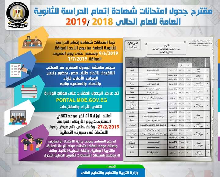 نشر المركز الإعلامي لمجلس الوزراء, إنفوجراف عن مقترح جدول امتحانات شهادة إتمام الدراسة للثانوية العامة للعام الحالي 2018/2019, أوضح من خلاله أنه من المقرر أن تبدأ الامتحانات من يوم الأحد الموافق 9 يونيه وتستمر حتى يوم الخميس الموافق 1يوليو2019, علماً بأنه سيتم مناقشة هذا الجدول مع المكتب التنفيذي لاتحاد طلاب مصر، بحضور رئيس المجلس الأعلى للآباء والأمناء والمعلمين ونائبه.