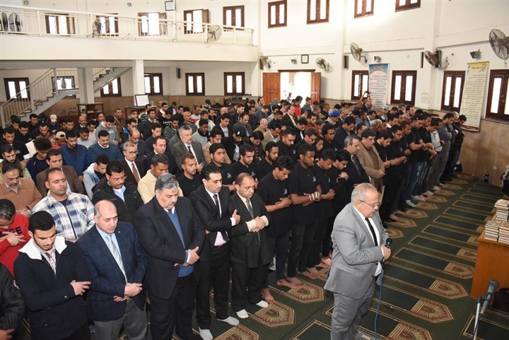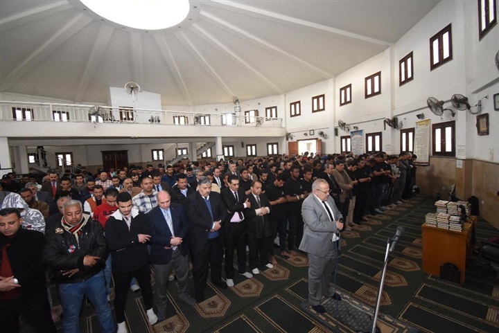 وأدى الصلاة نواب رئيس الجامعة، وعمداء الكليات، والعاملين، والطلاب، وذلك بمسجد كلية التجارة بالحرم الجامعي.