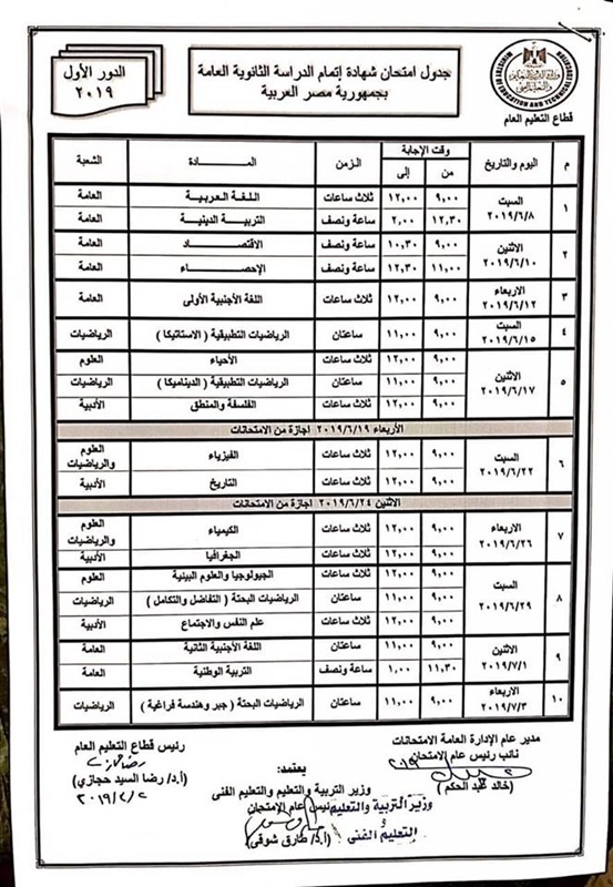 اعتمد الدكتور طارق شوقي، وزير التربية والتعليم والتعليم الفني، مساء اليوم السبت 2 مارس 2019، جدول امتحانات الدور الأول لشهادة اتمام الدراسة الثانوية العامة بجمهورية مصر العربية للعام الدراسي الحالي 2018/2019، متمنيا النجاح والتوفيق لجميع الطلاب المتقدمين لأداء الامتحان هذا العام.
