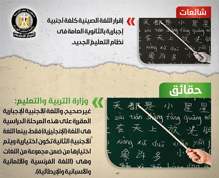 أكدت "الصفحة الرسمية لمجلس الوزراء" أنه لم يتم إقرار اللغة الصينية كلغة أجنبية إجبارية بالثانوية العامة في نظام التعليم الجديد.
