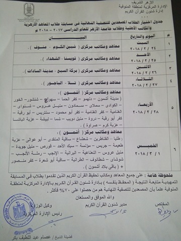 الأكبر لحفظ القرآن الكريم، بمنطقة المنوفية، والتي أقيمت تصفياتها الأوّليّة في شهر