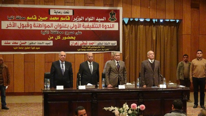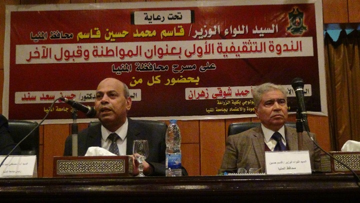 شهد الدكتور مصطفى عبدالنبي، رئيس جامعة المنيا، اليوم الأربعاء، الندوة التثقيفية التى نظمتها محافظة المنيا بحضور اللواء قاسم حسين محافظ المنيا، ومحمد عبدالفتاح السكرتير العام للمحافظة، وعددًا من نواب البرلمان، والتي جاءت بعنوان "المواطنة وقبول الآخر" وذلك ضمن مجموعة من الفعاليات والأنشطة التي تنظمها المحافظة في إطار الخطة العامة للتوعية المجتمعية والارتقاء بالفكر والثقافة العامة، وإيجاد الطرق المتعددة في كيفية تقبل الآخر والمحافظة على حقوق المواطنة.