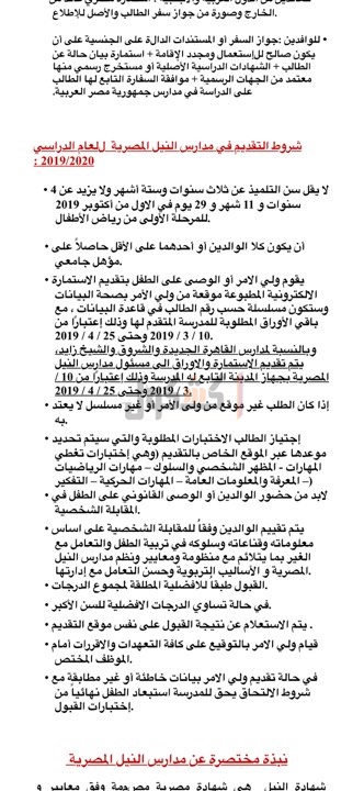 ننشر شروط التقديم بمدارس النيل المصرية للعام الدراسي2019 /2020