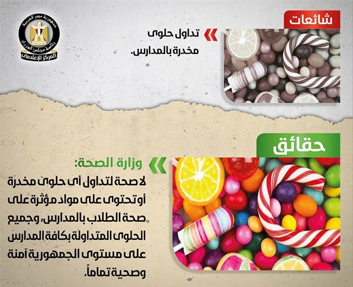 وأكدت وزارة الصحة أنه لاصحة لتداول أي حلوى مخدرة أو تحتوي على مواد مؤثرة على صحة الطلاب بالمدارس، كما أكدت أن جميع الحلوى المتداولة بكافة المدارس على مستوى الجمهورية أمة وصحية تماما.