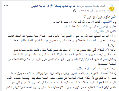 الأزهر بجامعة الأزهر فرع الوجه القبلى، اليوم التطوعي لطلاب الفرع الجامعة، ذلك مقابل