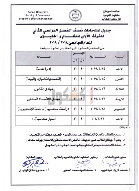 ننشر جدول امتحانات "الميد ترم" للفرقة الأولى بتجارة سوهاج