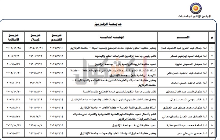 أعلن المجلس الأعلي للجامعات القائكمة النهائية للمرشحين علي منصب رئيس جامعة الزقازيق، حيث ينافس علي المنصب 11 مرشح وهم كالتالي: